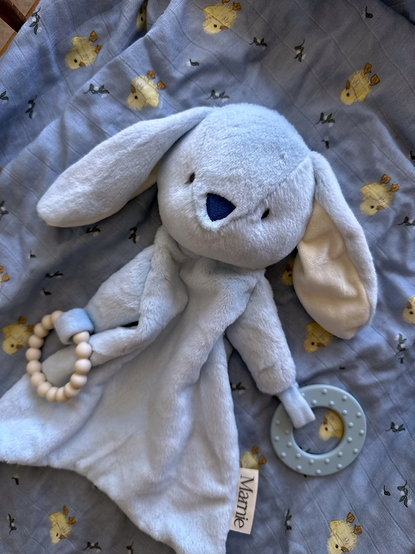 Beautifully buttery soft Marnie comforter makes the most beautiful friend for your little one. Made from a plush and wonderfully soft fabric in our pastel blue colour, featuring two food grade silicone teethers for your little one to chew, with velvety soft ears and body. Your Marnie will become a very loved and cherished friend for years to come!