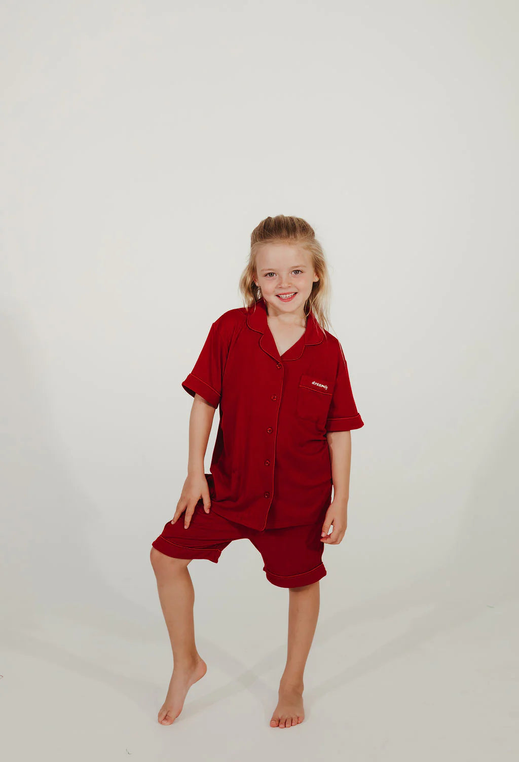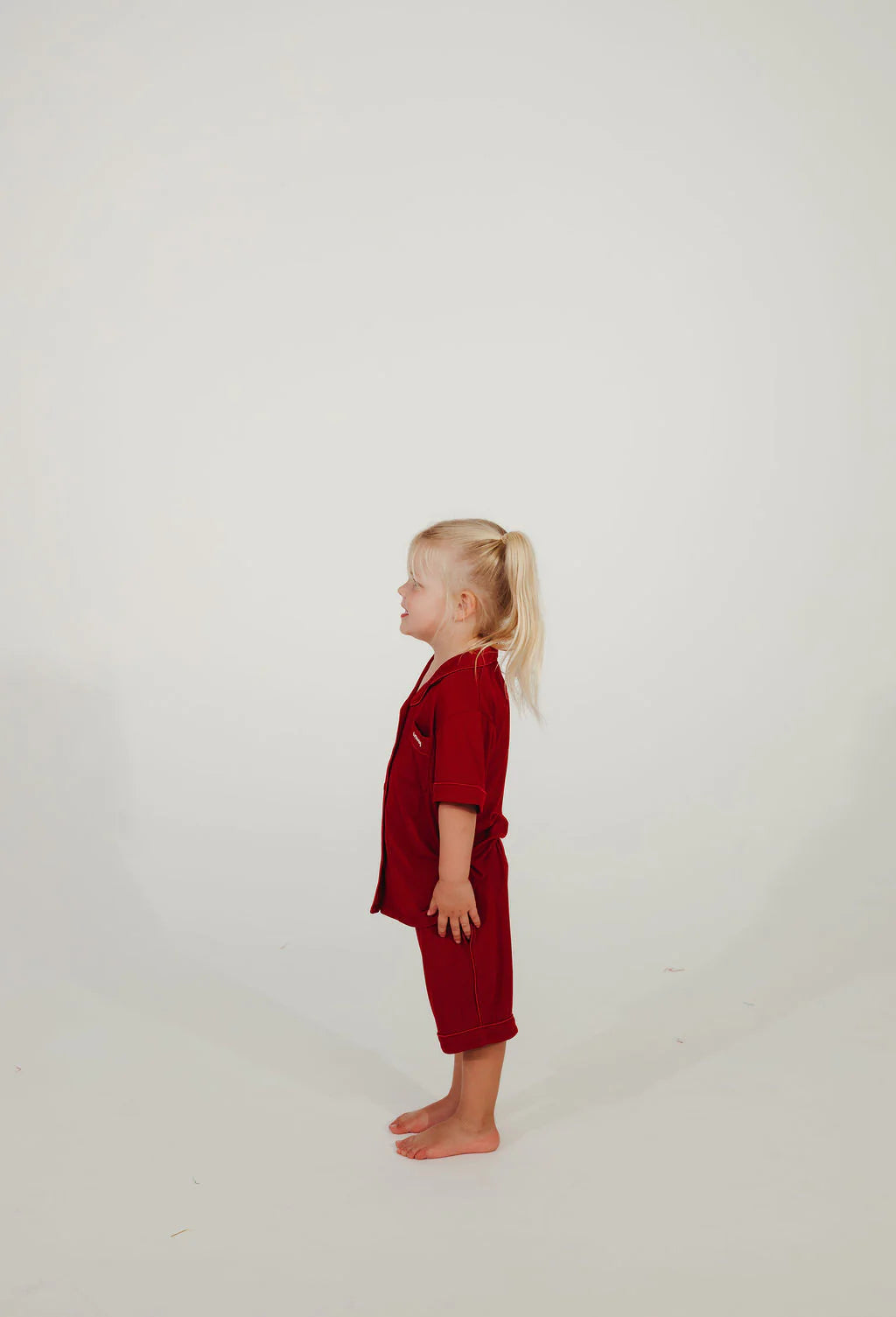 Make bedtime magical with our Festive Red Kids Pyjama Set, crafted from ultra-soft ribbed modal fabric for comfort that lasts. These luxury children’s pyjamas feature short sleeves, 100% silk piping, and a breathable design that keeps your child cool and cosy all night long.