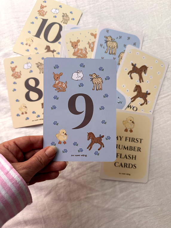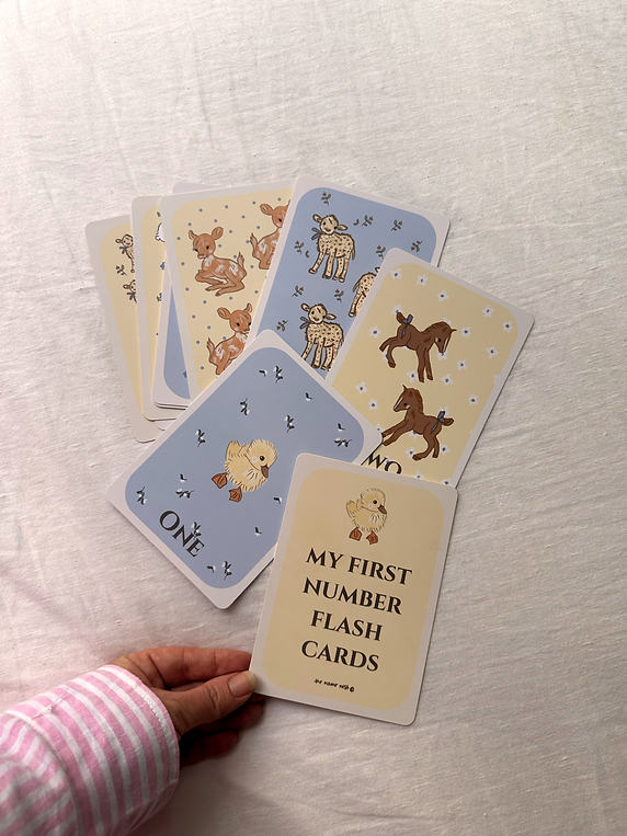 Each deck contains 11 beautiful double sided cards, featuring numbers 1-10 for your little one's learning journey. Each number features a cute little farm animal, making it a fun game to count each while learning numbers!